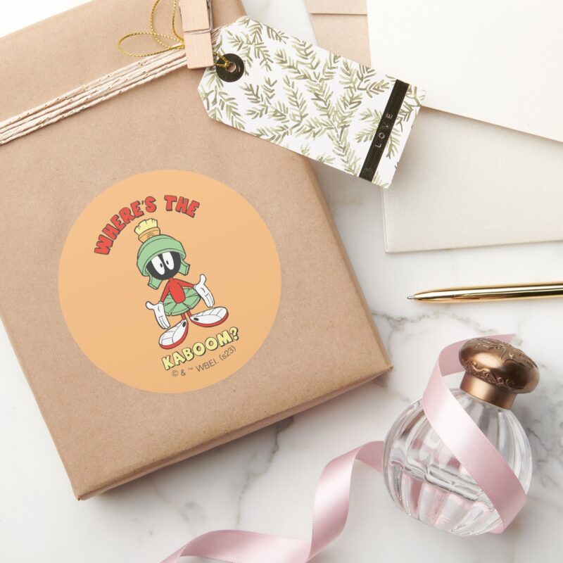 MARVIN THE MARTIAN™ Wheres The Kaboom Classic Round Sticker vinyl sticker, waterproof durable collectible sticker for laptop, phone, bottle, bike, notebook, helmet, and accessories.