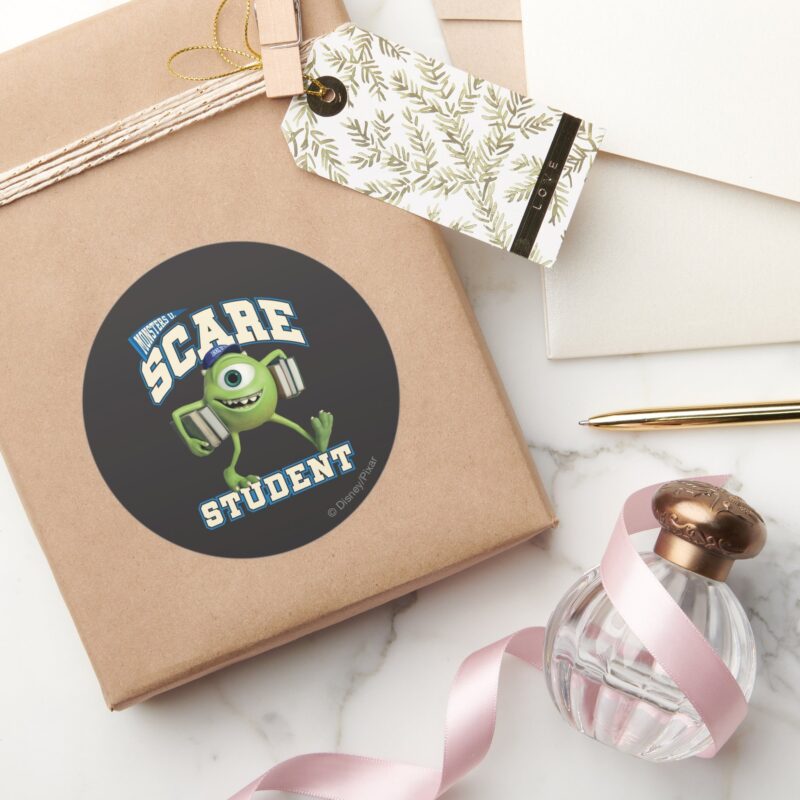 Mike Scare Student 2 Classic Round Sticker vinyl sticker, waterproof durable collectible sticker for laptop, phone, bottle, bike, notebook, helmet, and accessories.