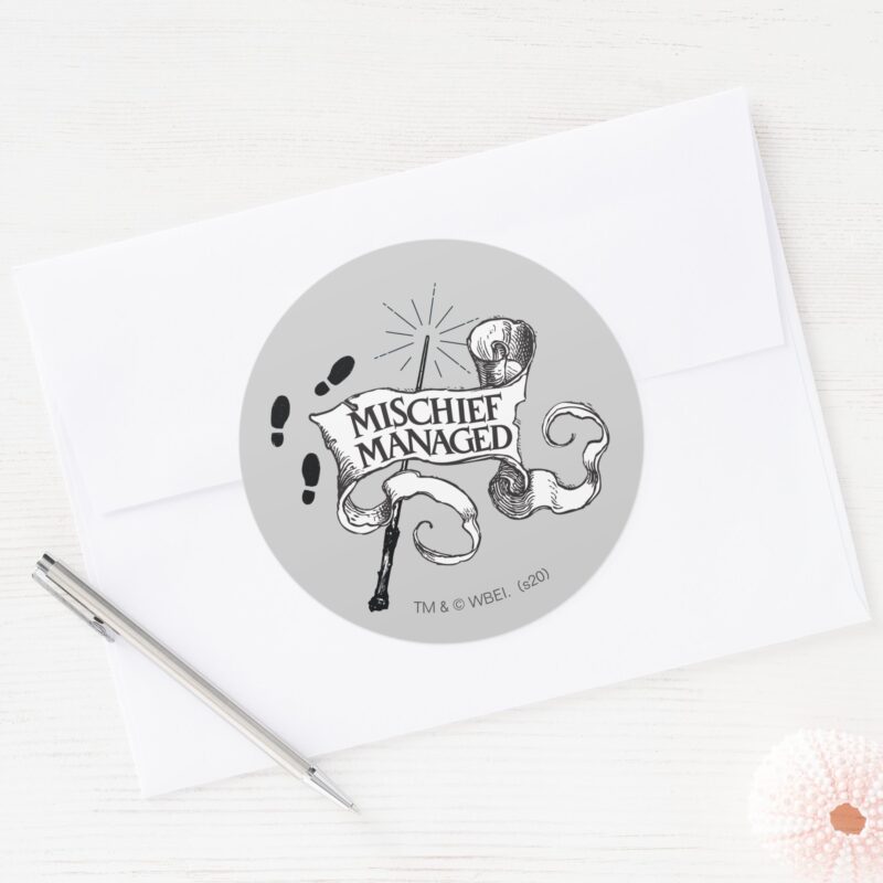 Mischief Managed Classic Round Sticker vinyl sticker, waterproof durable collectible sticker for laptop, phone, bottle, bike, notebook, helmet, and accessories.