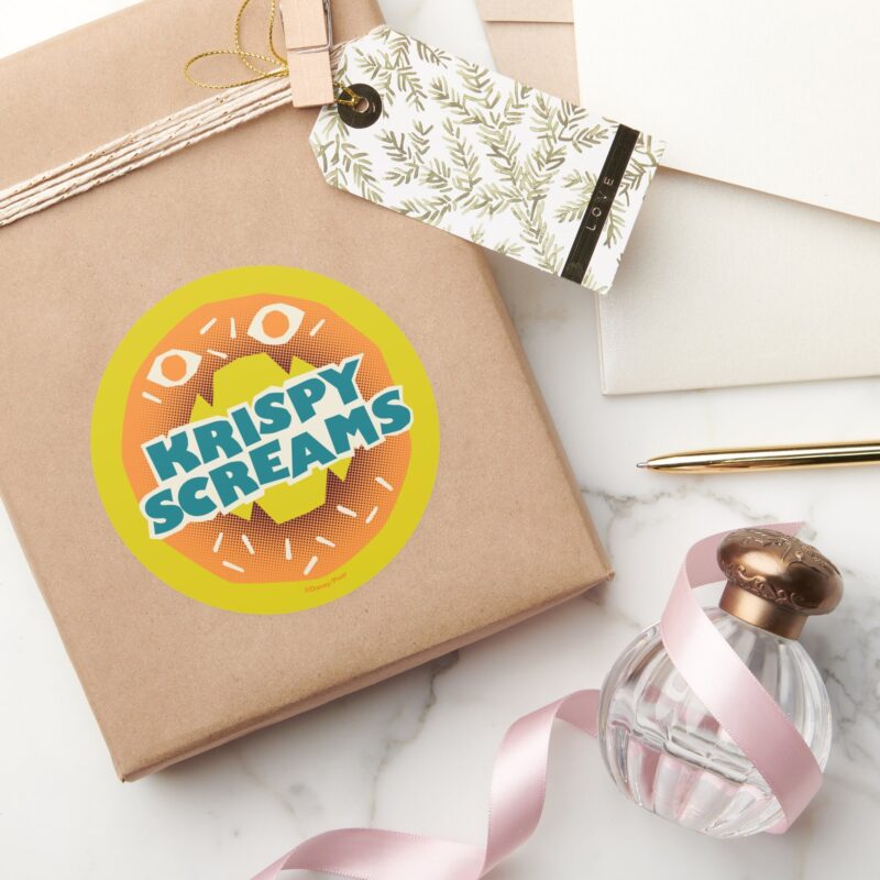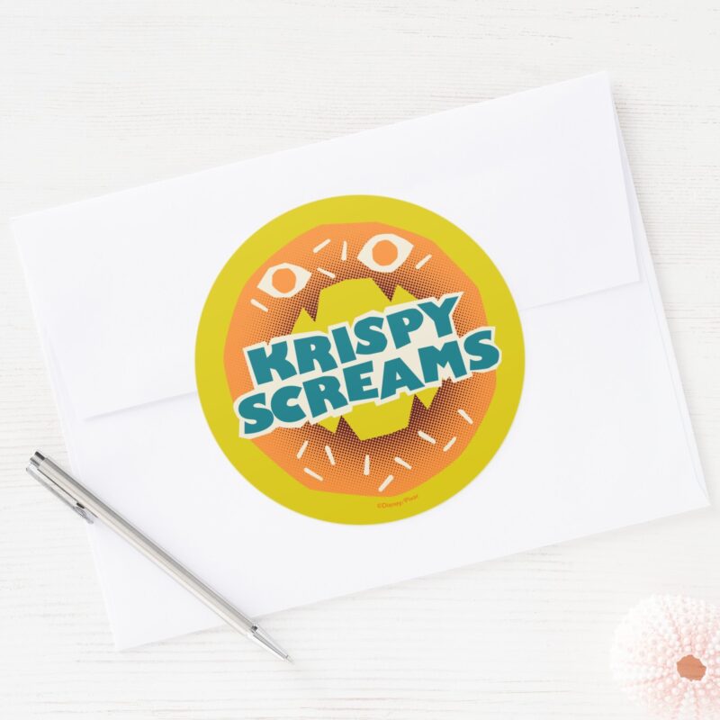 Monsters At Work Krispy Screams Classic Round Sticker vinyl sticker, waterproof durable collectible sticker for laptop, phone, bottle, bike, notebook, helmet, and accessories.