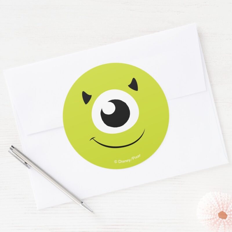 Monsters Inc. Mike Face Classic Round Sticker vinyl sticker, waterproof durable collectible sticker for laptop, phone, bottle, bike, notebook, helmet, and accessories.