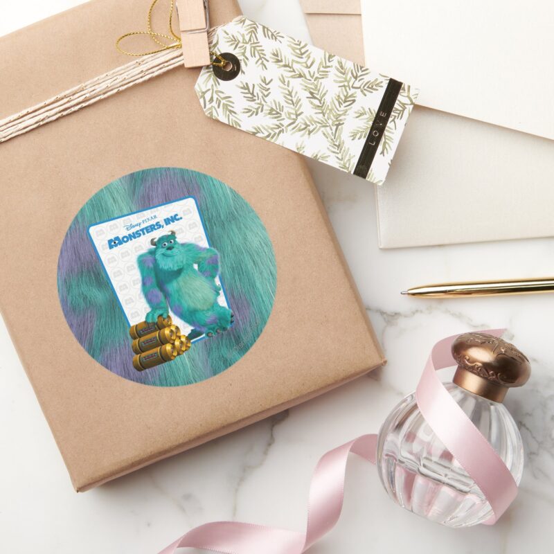 Monsters Inc. Sulley Classic Round Sticker vinyl sticker, waterproof durable collectible sticker for laptop, phone, bottle, bike, notebook, helmet, and accessories.