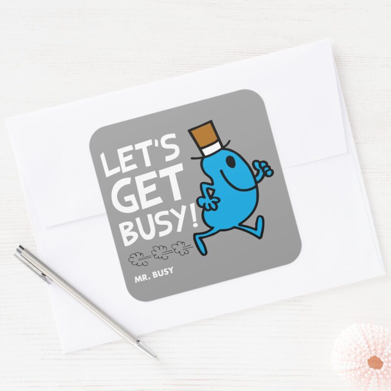 Mr. Busy Lets Get Busy White Text Square Sticker vinyl sticker, waterproof durable collectible sticker for laptop, phone, bottle, bike, notebook, helmet, and accessories.