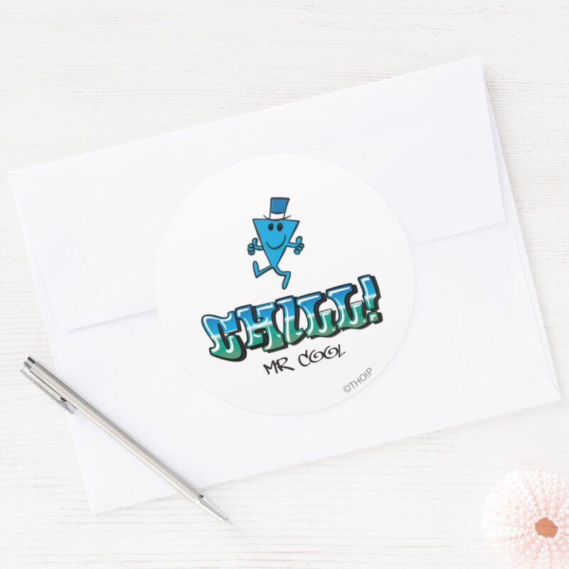 Mr. Cool Chilling Out Classic Round Sticker vinyl sticker, waterproof durable collectible sticker for laptop, phone, bottle, bike, notebook, helmet, and accessories.