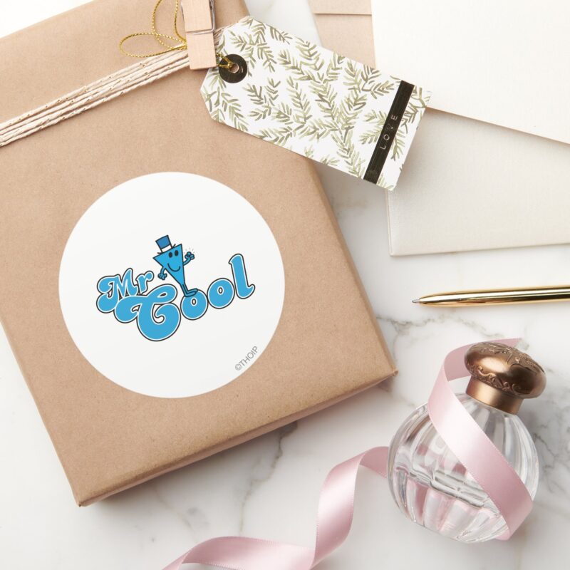 Mr. Cool Happy Fist Pump Classic Round Sticker vinyl sticker, waterproof durable collectible sticker for laptop, phone, bottle, bike, notebook, helmet, and accessories.