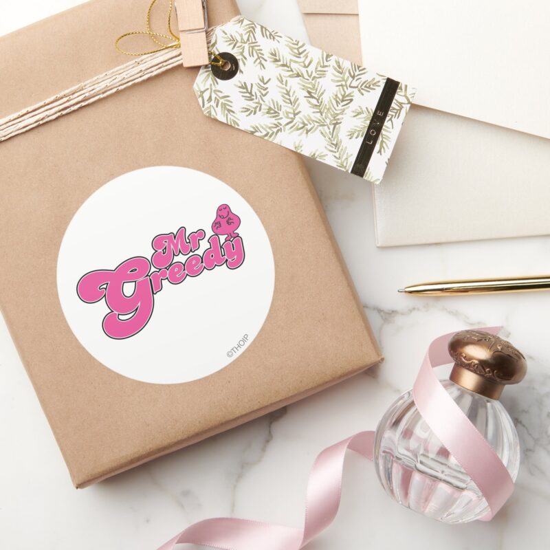 Mr. Greedy Standing Around Classic Round Sticker vinyl sticker, waterproof durable collectible sticker for laptop, phone, bottle, bike, notebook, helmet, and accessories.