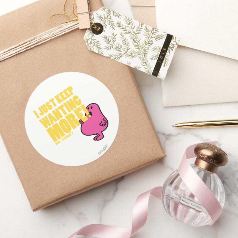 Mr. Greedy Wants More Classic Round Sticker vinyl sticker, waterproof durable collectible sticker for laptop, phone, bottle, bike, notebook, helmet, and accessories.