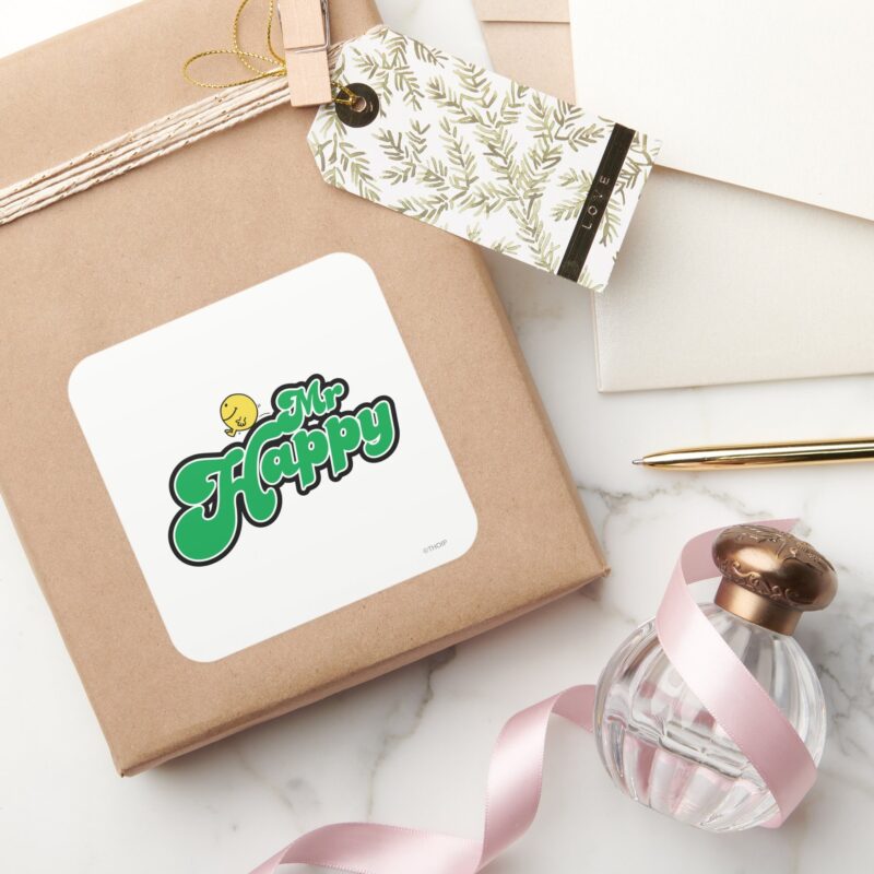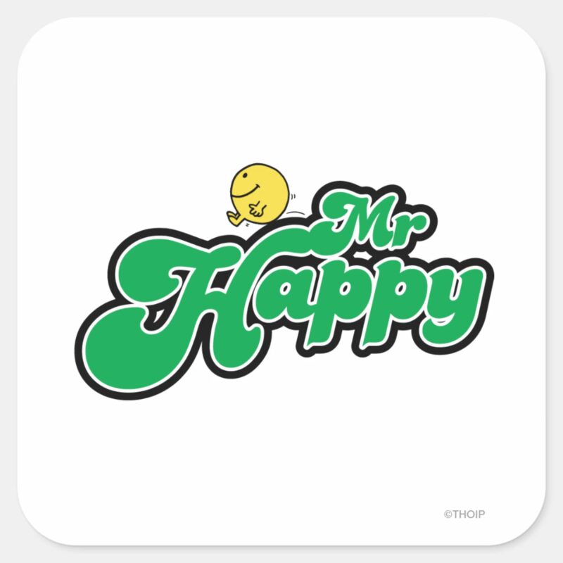 Mr. Happy Sliding Down Green Lettering Square Sticker