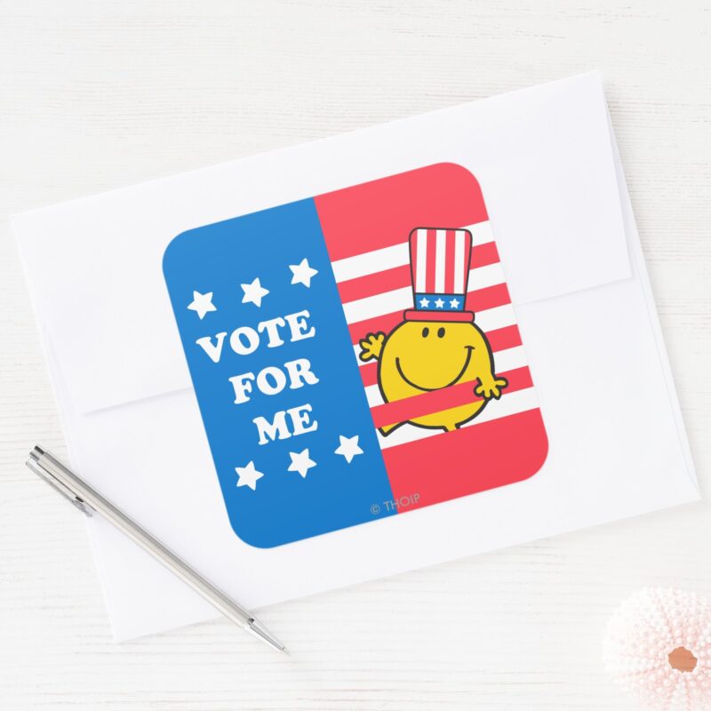 Mr. Happy Vote For Me Flag Square Sticker vinyl sticker, waterproof durable collectible sticker for laptop, phone, bottle, bike, notebook, helmet, and accessories.