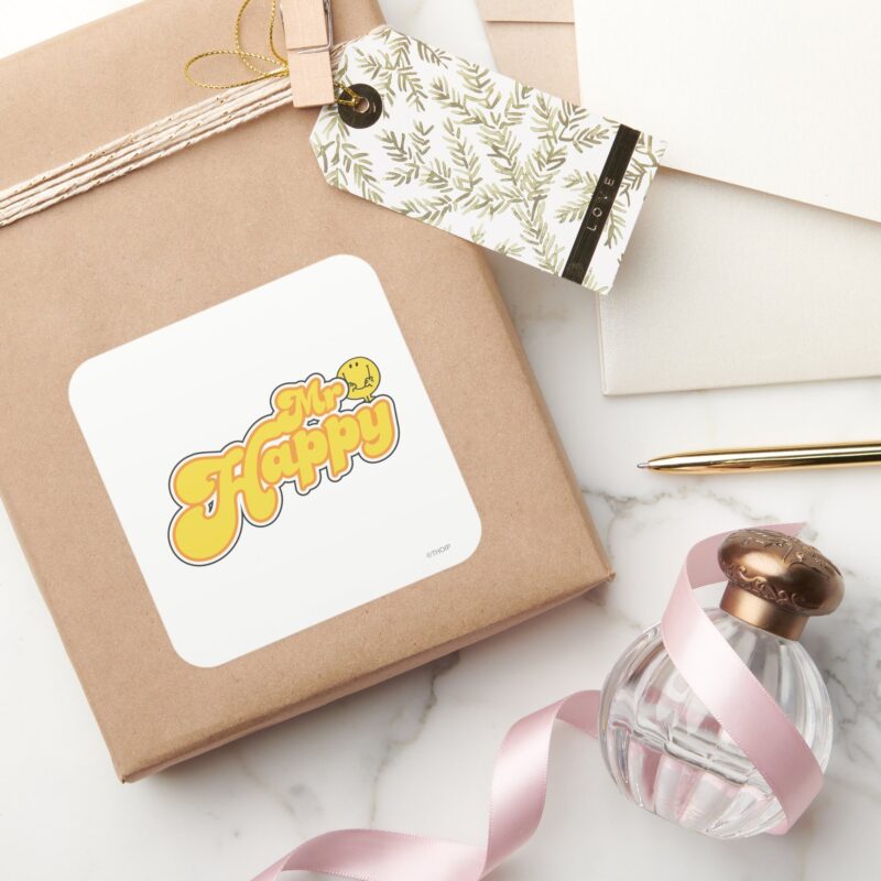Mr. Happy Yellow Lettering Square Sticker vinyl sticker, waterproof durable collectible sticker for laptop, phone, bottle, bike, notebook, helmet, and accessories.