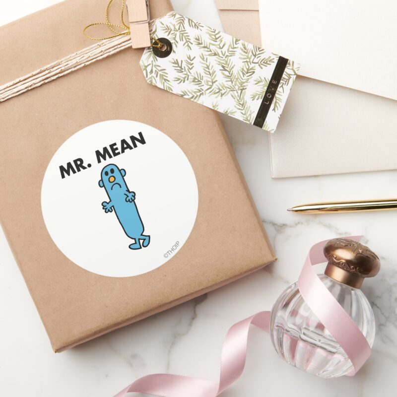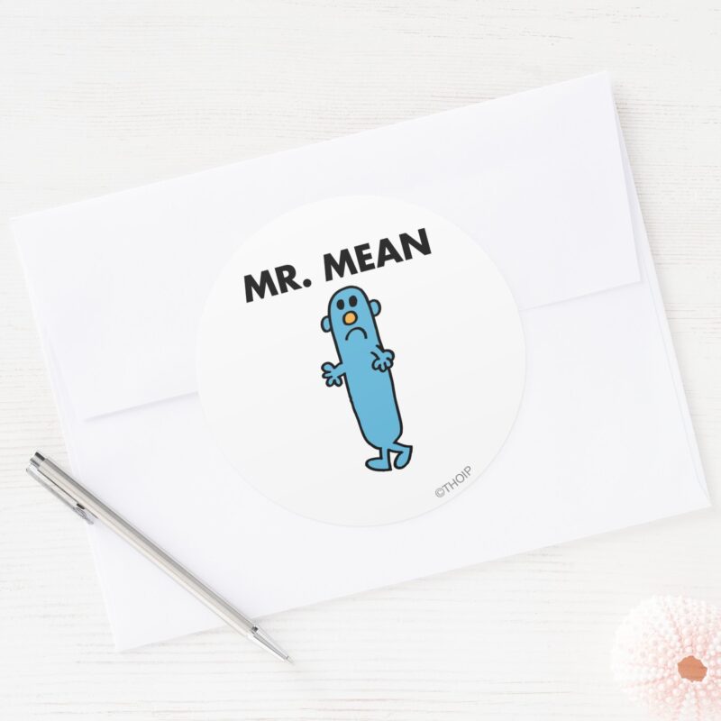 Mr. Mean Classic Pose Classic Round Sticker vinyl sticker, waterproof durable collectible sticker for laptop, phone, bottle, bike, notebook, helmet, and accessories.