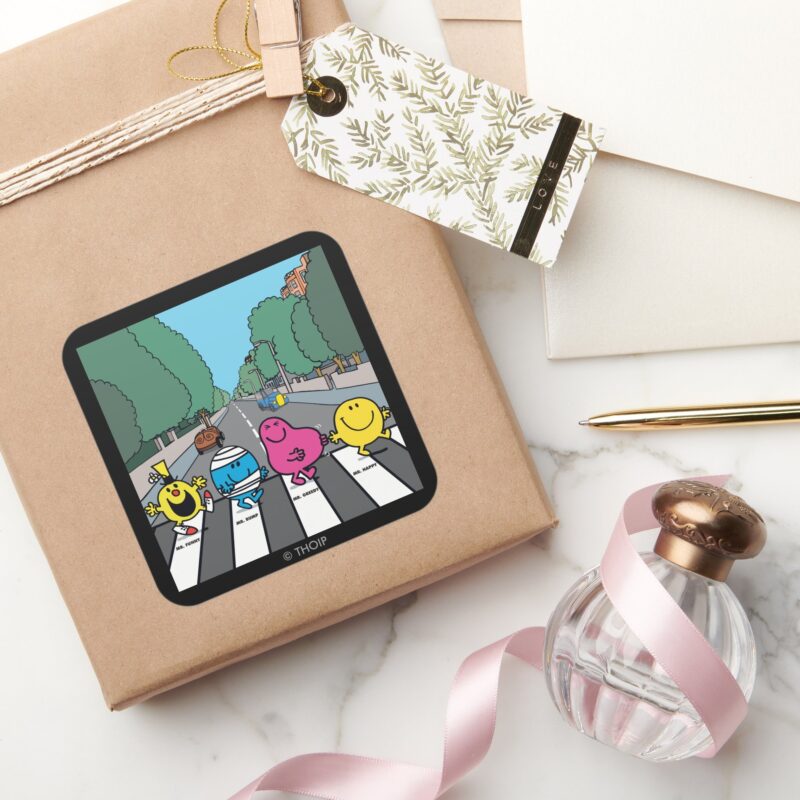 Mr. Men Abbey Road Walkers Square Sticker vinyl sticker, waterproof durable collectible sticker for laptop, phone, bottle, bike, notebook, helmet, and accessories.
