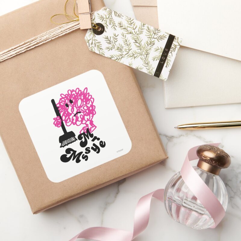 Mr. Messy Broom Name Square Sticker vinyl sticker, waterproof durable collectible sticker for laptop, phone, bottle, bike, notebook, helmet, and accessories.