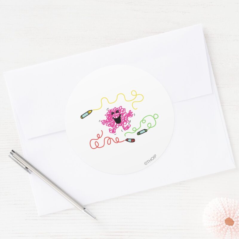 Mr. Messy Playing With Crayons Classic Round Sticker vinyl sticker, waterproof durable collectible sticker for laptop, phone, bottle, bike, notebook, helmet, and accessories.