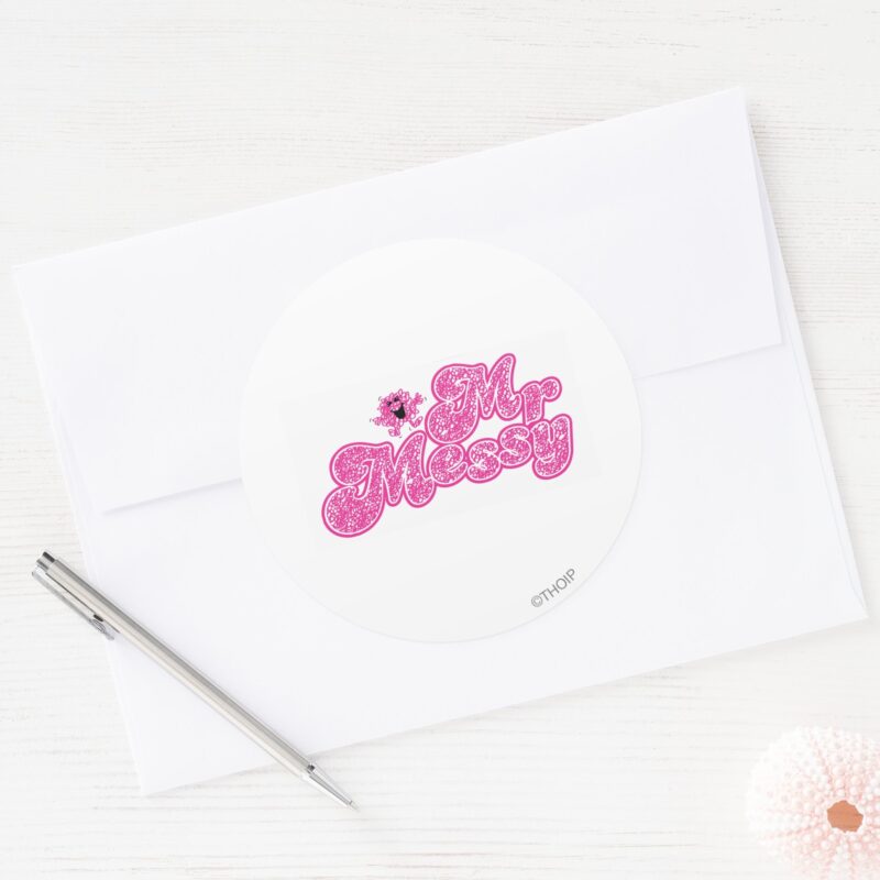 Mr. Messy Sparkling Pink Name Classic Round Sticker vinyl sticker, waterproof durable collectible sticker for laptop, phone, bottle, bike, notebook, helmet, and accessories.