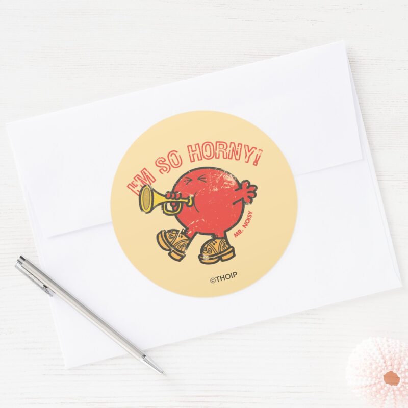 Mr. Noisy Tooting His Horn Classic Round Sticker vinyl sticker, waterproof durable collectible sticker for laptop, phone, bottle, bike, notebook, helmet, and accessories.