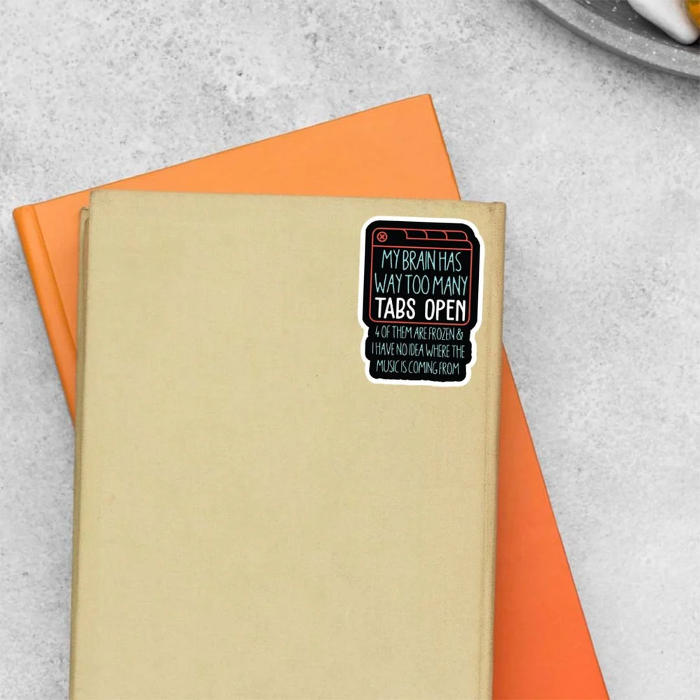 My Brain Has Way Too Many Tabs Open Witty Stickers vinyl sticker, waterproof durable collectible sticker for laptop, phone, bottle, bike, notebook, helmet, and accessories.