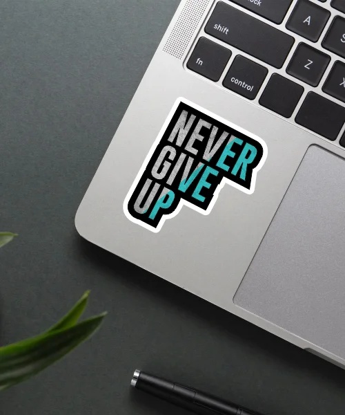 Never Give Up Sticker vinyl sticker, waterproof durable collectible sticker for laptop, phone, bottle, bike, notebook, helmet, and accessories.