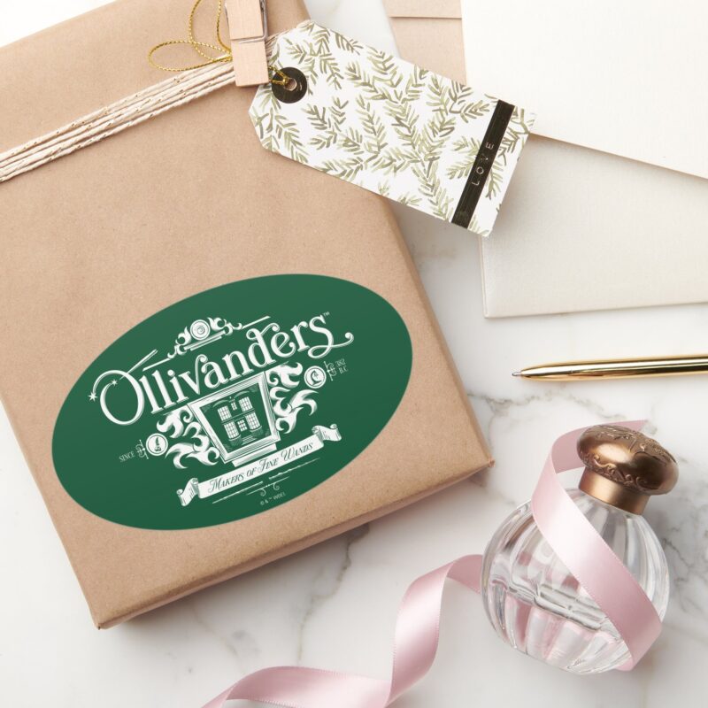 OLIVANDERS™ Makers Of Fine Wands Oval Sticker vinyl sticker, waterproof durable collectible sticker for laptop, phone, bottle, bike, notebook, helmet, and accessories.