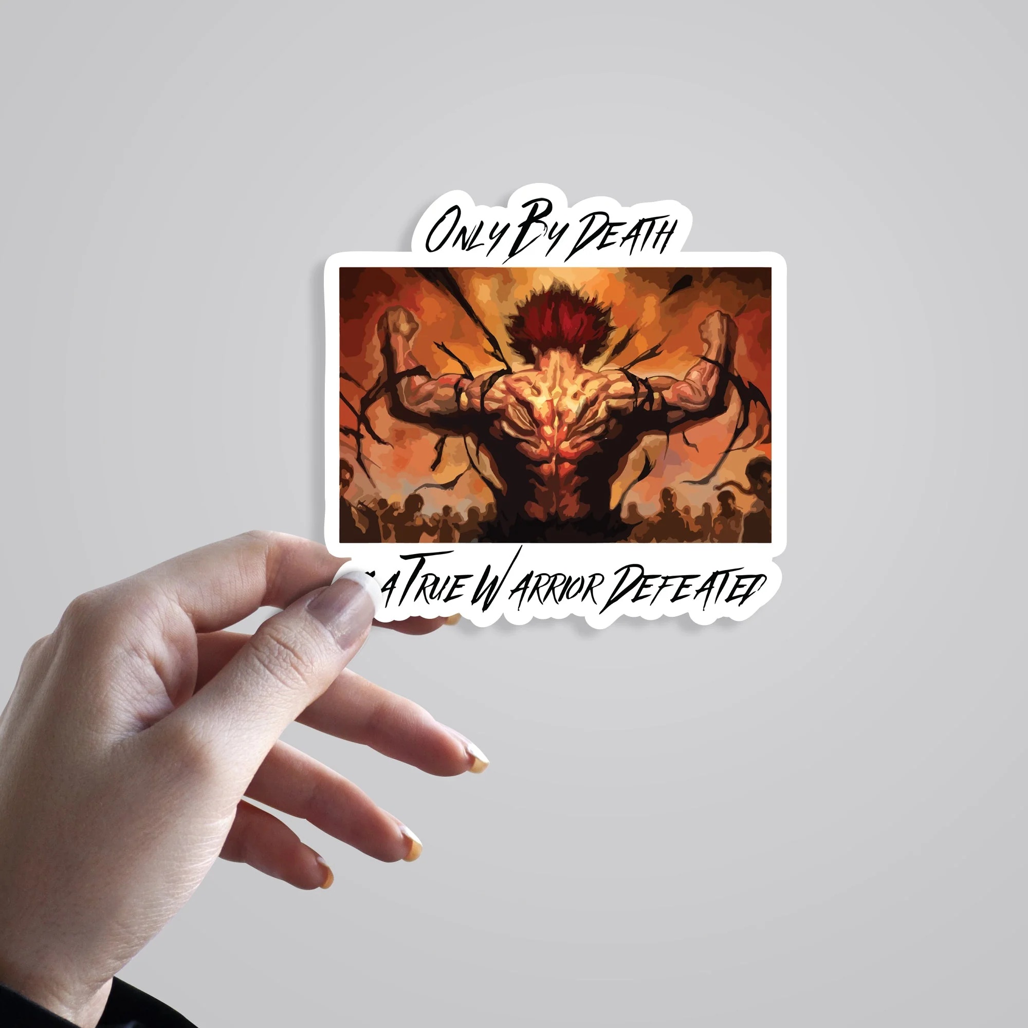 Only By Death Is A True Warrior Defeated Anime Stickers vinyl sticker, waterproof durable collectible sticker for laptop, phone, bottle, bike, notebook, helmet, and accessories.