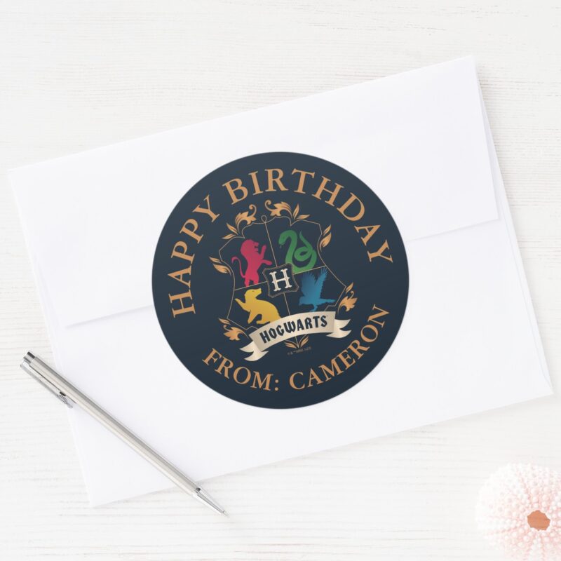 Ornate HOGWARTS™ House Crest Happy Birthday Classic Round Sticker vinyl sticker, waterproof durable collectible sticker for laptop, phone, bottle, bike, notebook, helmet, and accessories.
