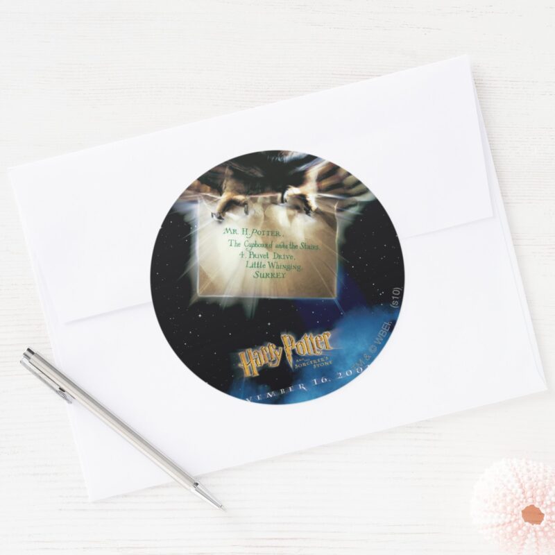 Owl With Letter Movie Poster Classic Round Sticker vinyl sticker, waterproof durable collectible sticker for laptop, phone, bottle, bike, notebook, helmet, and accessories.