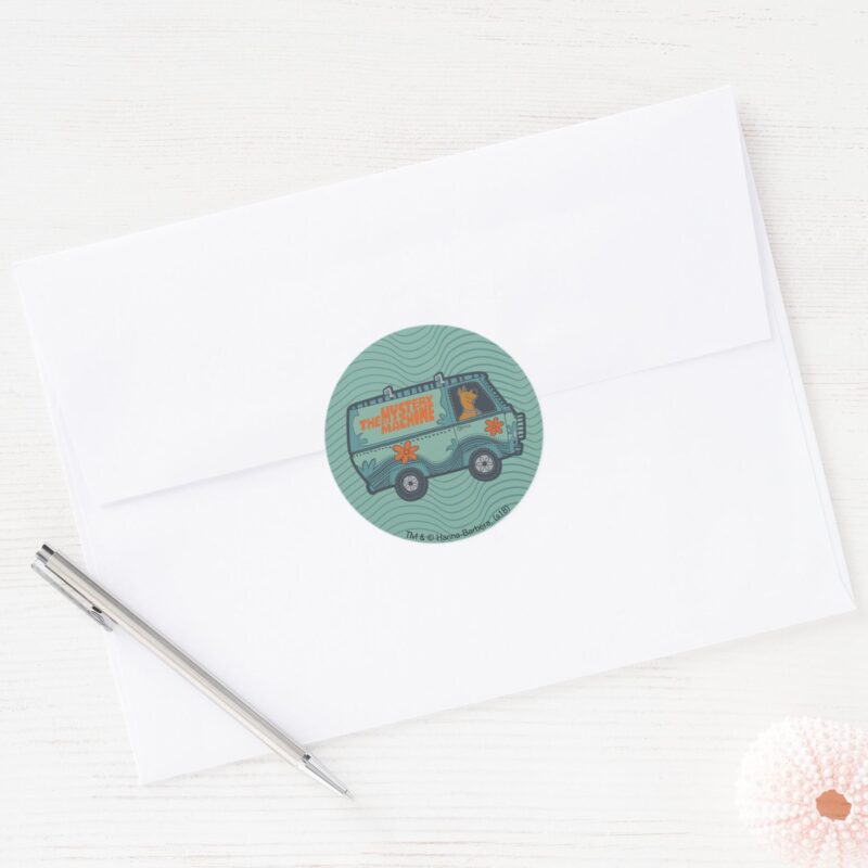 Paisely Scooby Doo Driving Mystery Machine Classic Round Sticker vinyl sticker, waterproof durable collectible sticker for laptop, phone, bottle, bike, notebook, helmet, and accessories.