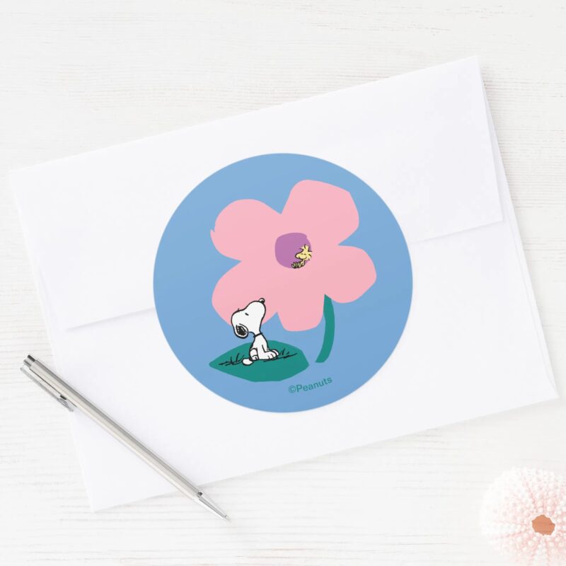 Peanuts Illustrating Nature Pink Flower Classic Round Sticker vinyl sticker, waterproof durable collectible sticker for laptop, phone, bottle, bike, notebook, helmet, and accessories.