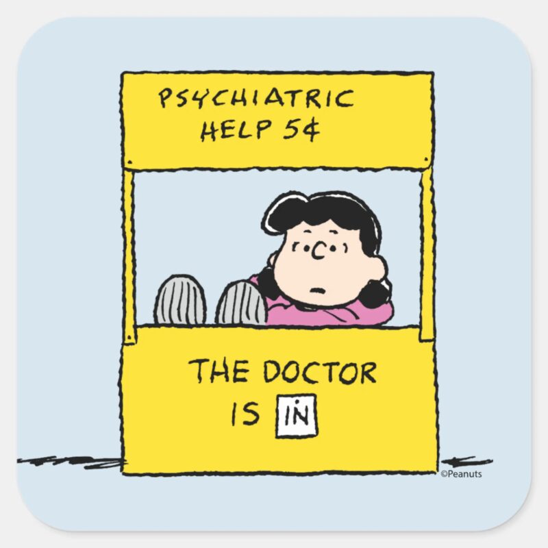 Peanuts Lucy The Doctor Is In Square Sticker vinyl sticker, waterproof durable collectible sticker for laptop, phone, bottle, bike, notebook, helmet, and accessories.