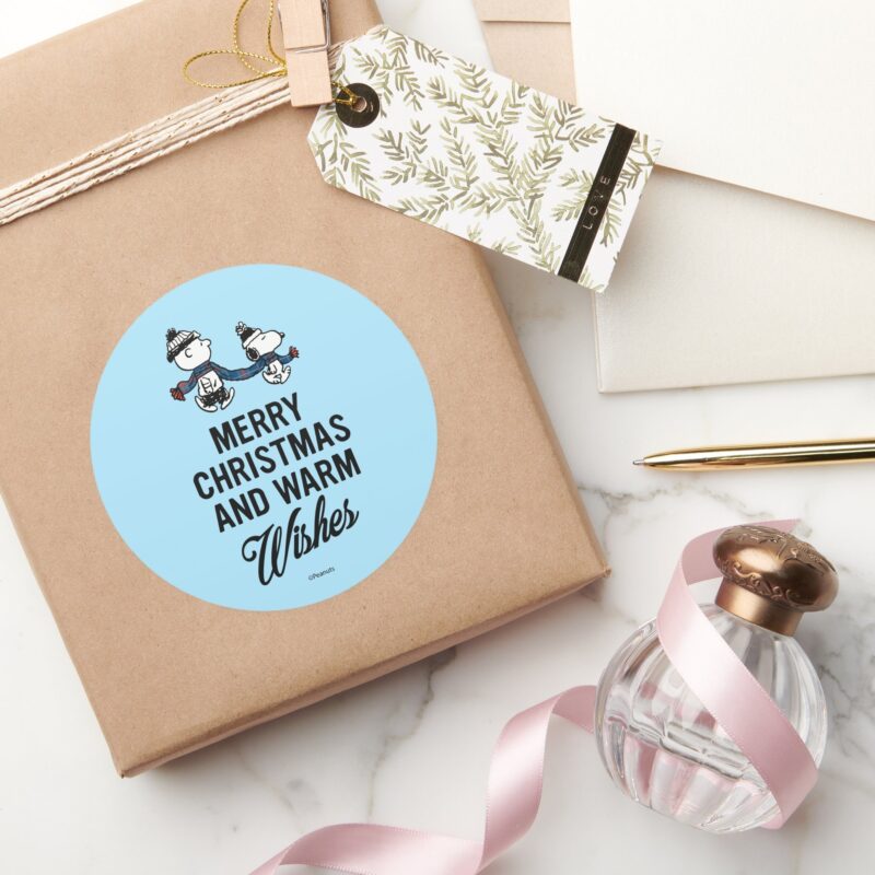 Peanuts Merry Christmas Snoopy Charlie Brown Classic Round Sticker vinyl sticker, waterproof durable collectible sticker for laptop, phone, bottle, bike, notebook, helmet, and accessories.
