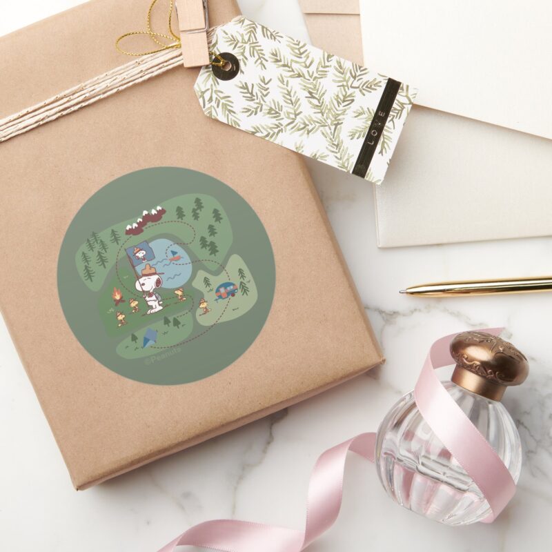 Peanuts Nestled In The Mountains Campsite Classic Round Sticker vinyl sticker, waterproof durable collectible sticker for laptop, phone, bottle, bike, notebook, helmet, and accessories.