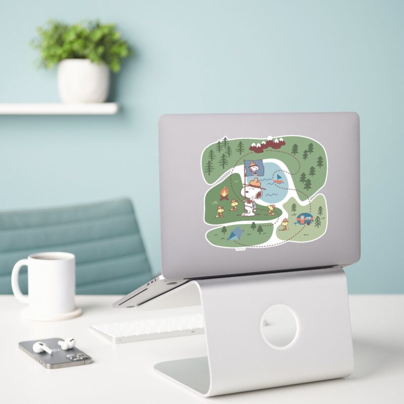 Peanuts Nestled In The Mountains Campsite Sticker vinyl sticker, waterproof durable collectible sticker for laptop, phone, bottle, bike, notebook, helmet, and accessories.