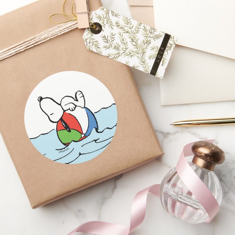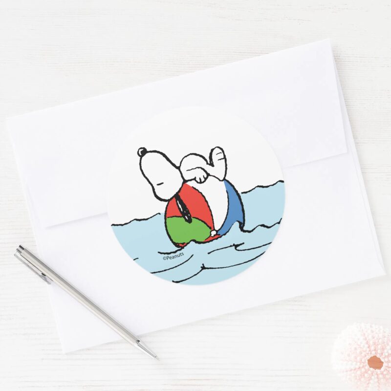 Peanuts Snoopy Beach Ball Beach Classic Round Sticker vinyl sticker, waterproof durable collectible sticker for laptop, phone, bottle, bike, notebook, helmet, and accessories.
