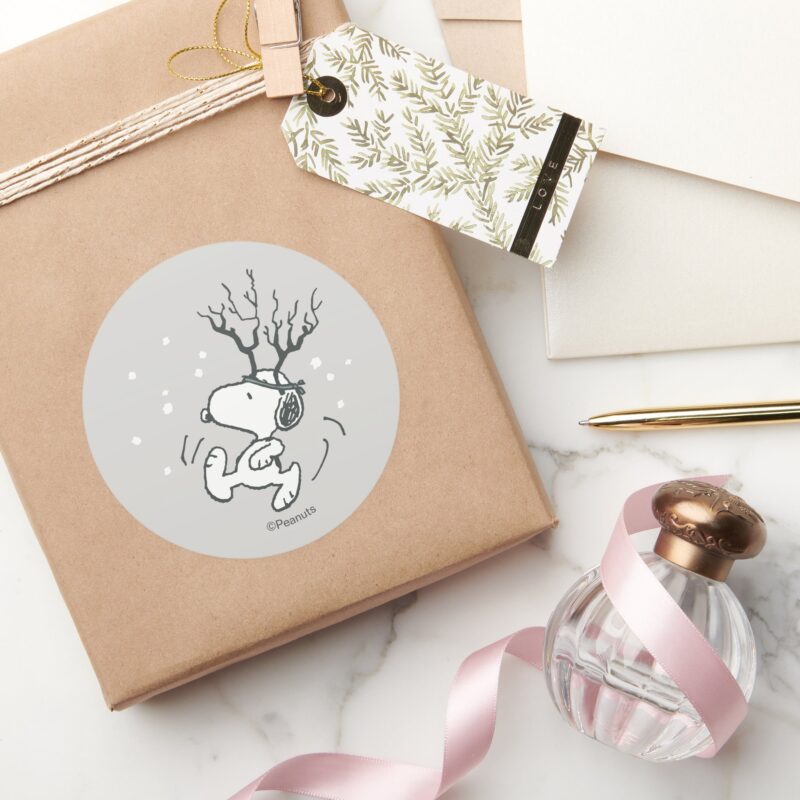 Peanuts Snoopy Reindeer Classic Round Sticker vinyl sticker, waterproof durable collectible sticker for laptop, phone, bottle, bike, notebook, helmet, and accessories.