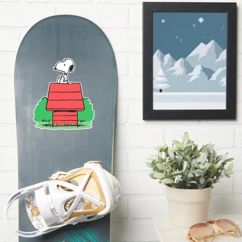 Peanuts Snoopy Resting On Doghouse Sticker vinyl sticker, waterproof durable collectible sticker for laptop, phone, bottle, bike, notebook, helmet, and accessories.