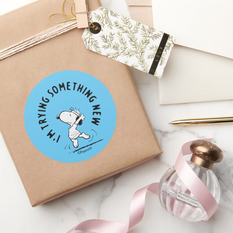 Peanuts Snoopy Trying Something New Classic Round Sticker vinyl sticker, waterproof durable collectible sticker for laptop, phone, bottle, bike, notebook, helmet, and accessories.
