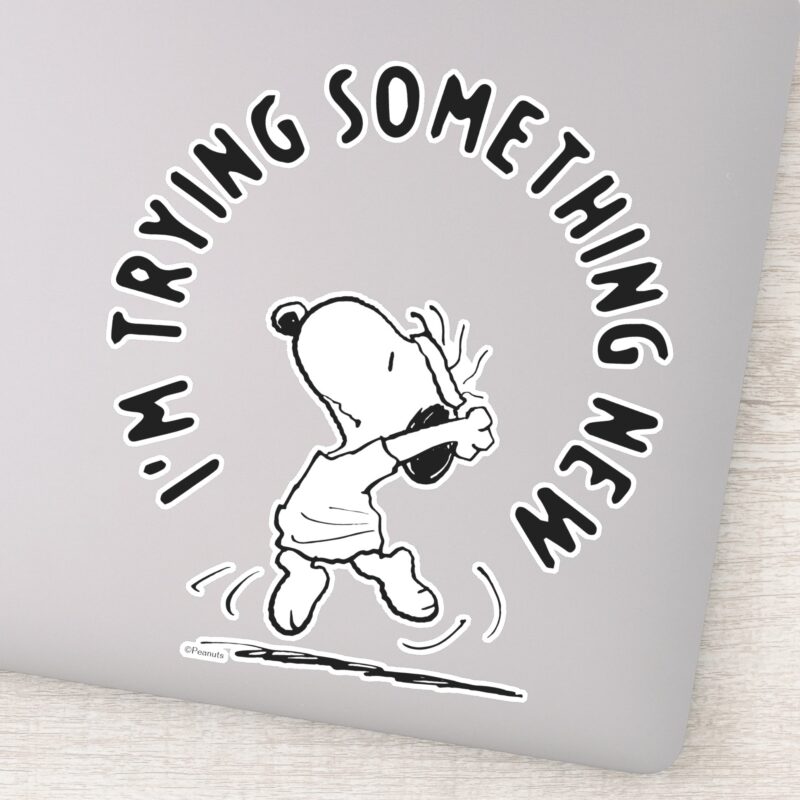 Peanuts Snoopy Trying Something New Sticker vinyl sticker, waterproof durable collectible sticker for laptop, phone, bottle, bike, notebook, helmet, and accessories.