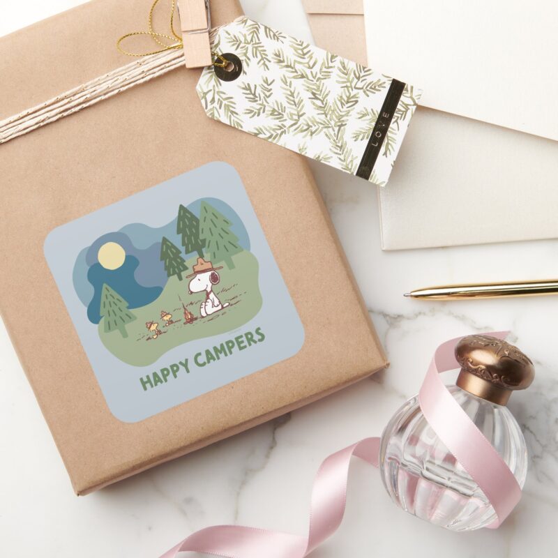 Peanuts Snoopy Woodstock Camp Site Square Sticker vinyl sticker, waterproof durable collectible sticker for laptop, phone, bottle, bike, notebook, helmet, and accessories.