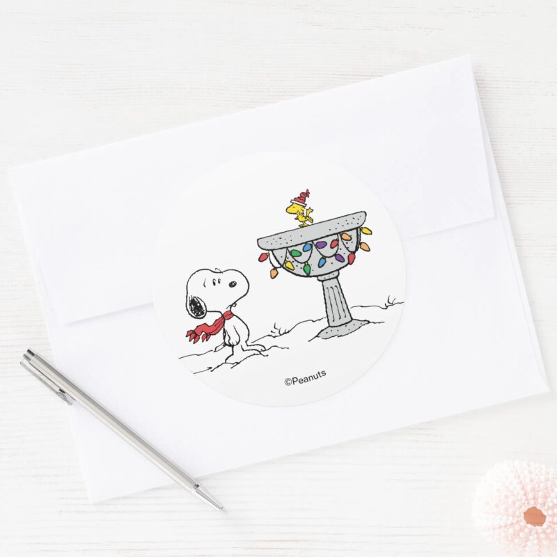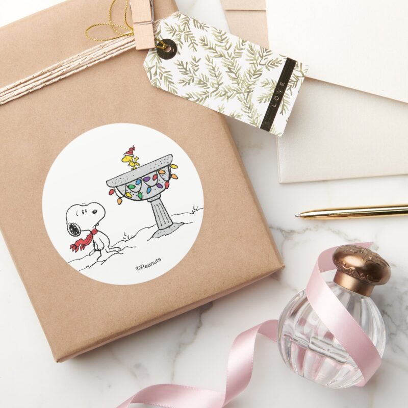 Peanuts Snoopy Woodstock Frozen Birdbath Classic Round Sticker vinyl sticker, waterproof durable collectible sticker for laptop, phone, bottle, bike, notebook, helmet, and accessories.