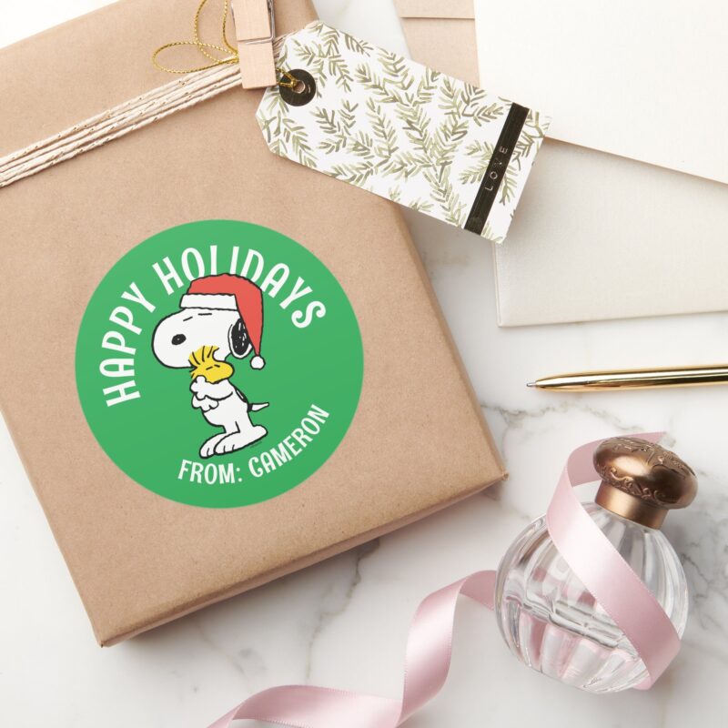 Peanuts Snoopy Woodstock Holiday Hugs Classic Round Sticker vinyl sticker, waterproof durable collectible sticker for laptop, phone, bottle, bike, notebook, helmet, and accessories.