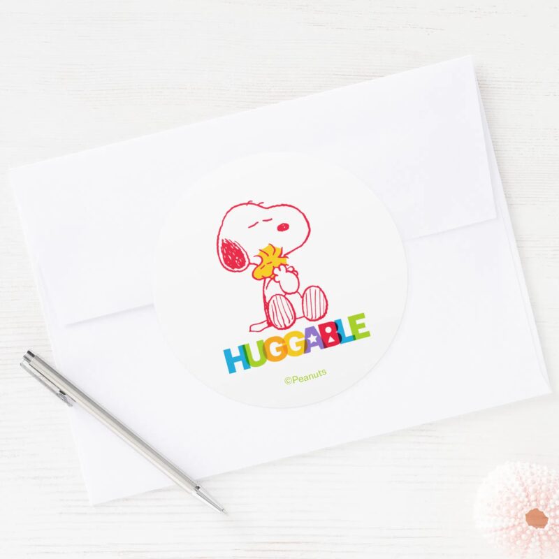Peanuts Snoopy Woodstock Huggable Classic Round Sticker vinyl sticker, waterproof durable collectible sticker for laptop, phone, bottle, bike, notebook, helmet, and accessories.