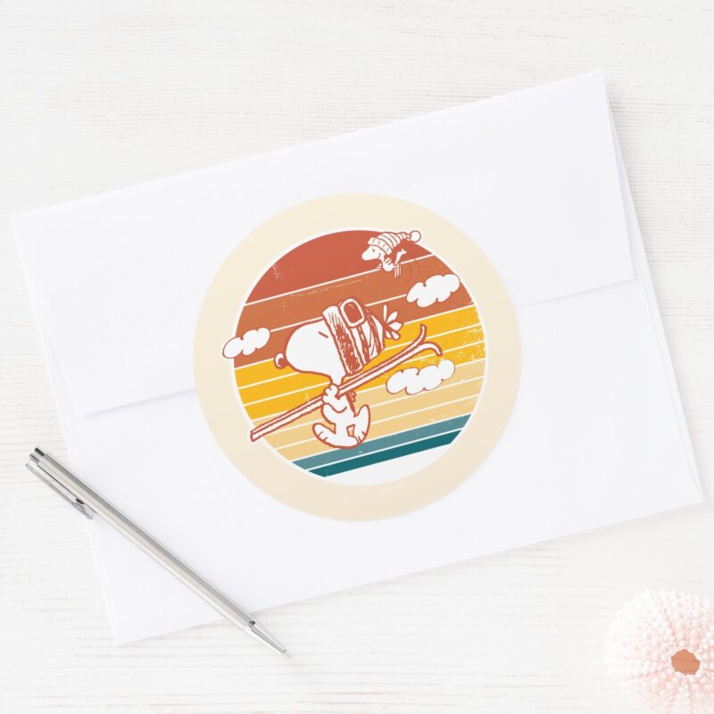 Peanuts Snoopy Woodstock Ski Trip Classic Round Sticker vinyl sticker, waterproof durable collectible sticker for laptop, phone, bottle, bike, notebook, helmet, and accessories.