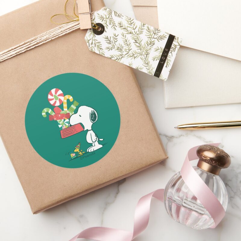 Peanuts The More The Merrier Classic Round Sticker vinyl sticker, waterproof durable collectible sticker for laptop, phone, bottle, bike, notebook, helmet, and accessories.