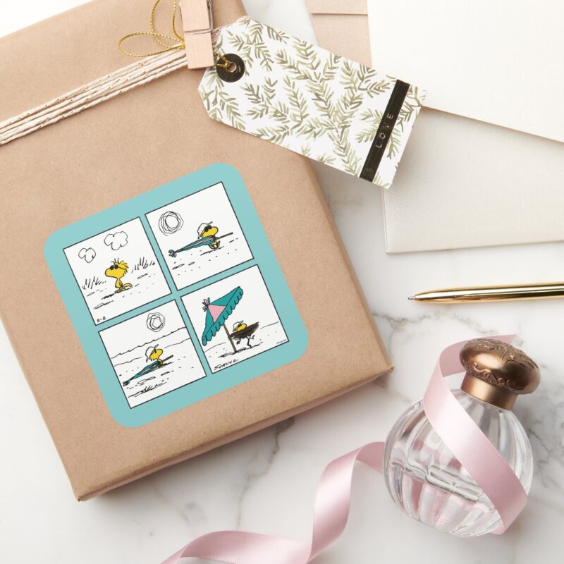 Peanuts Woodstock At The Beach Square Sticker vinyl sticker, waterproof durable collectible sticker for laptop, phone, bottle, bike, notebook, helmet, and accessories.