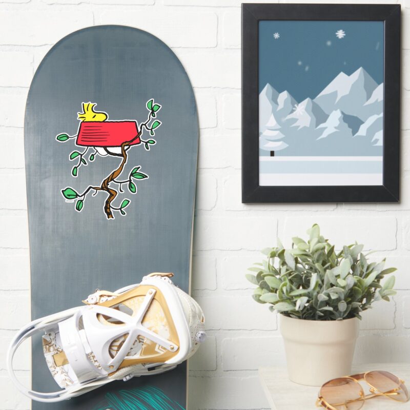 Peanuts Woodstock Napping In Snoopys Dish Sticker vinyl sticker, waterproof durable collectible sticker for laptop, phone, bottle, bike, notebook, helmet, and accessories.