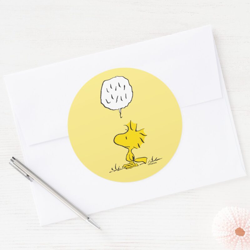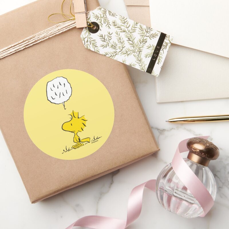Peanuts Woodstock Speaks Classic Round Sticker vinyl sticker, waterproof durable collectible sticker for laptop, phone, bottle, bike, notebook, helmet, and accessories.