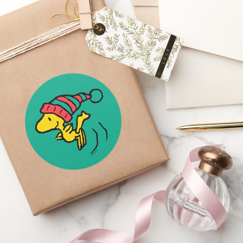 Peanuts Woodstock Winter Beanie Cap Classic Round Sticker vinyl sticker, waterproof durable collectible sticker for laptop, phone, bottle, bike, notebook, helmet, and accessories.