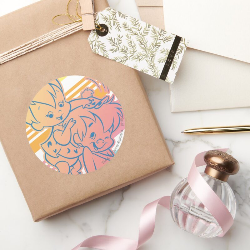 PEBBLES™ Grooming Bam Bam Classic Round Sticker vinyl sticker, waterproof durable collectible sticker for laptop, phone, bottle, bike, notebook, helmet, and accessories.