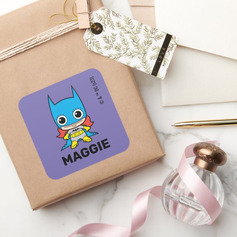Personalized Mini Batgirl Kids Label vinyl sticker, waterproof durable collectible sticker for laptop, phone, bottle, bike, notebook, helmet, and accessories.