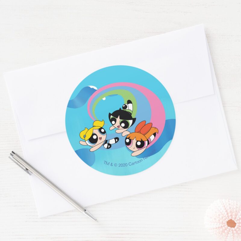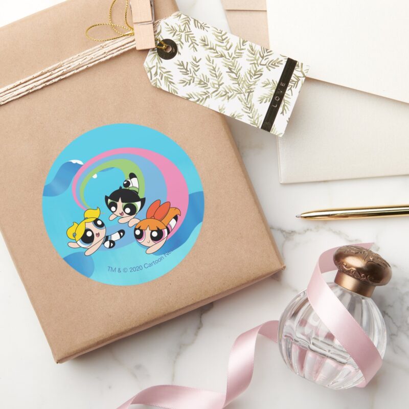 Powerpuff Girls Fly Through The Sky Classic Round Sticker vinyl sticker, waterproof durable collectible sticker for laptop, phone, bottle, bike, notebook, helmet, and accessories.